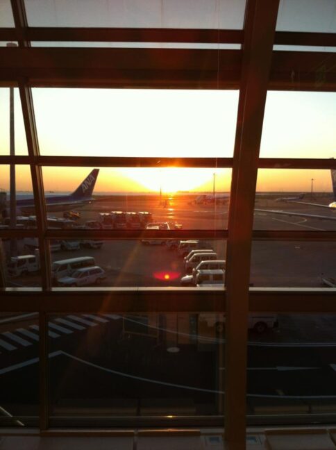 空港の床で寝ていた時の朝日